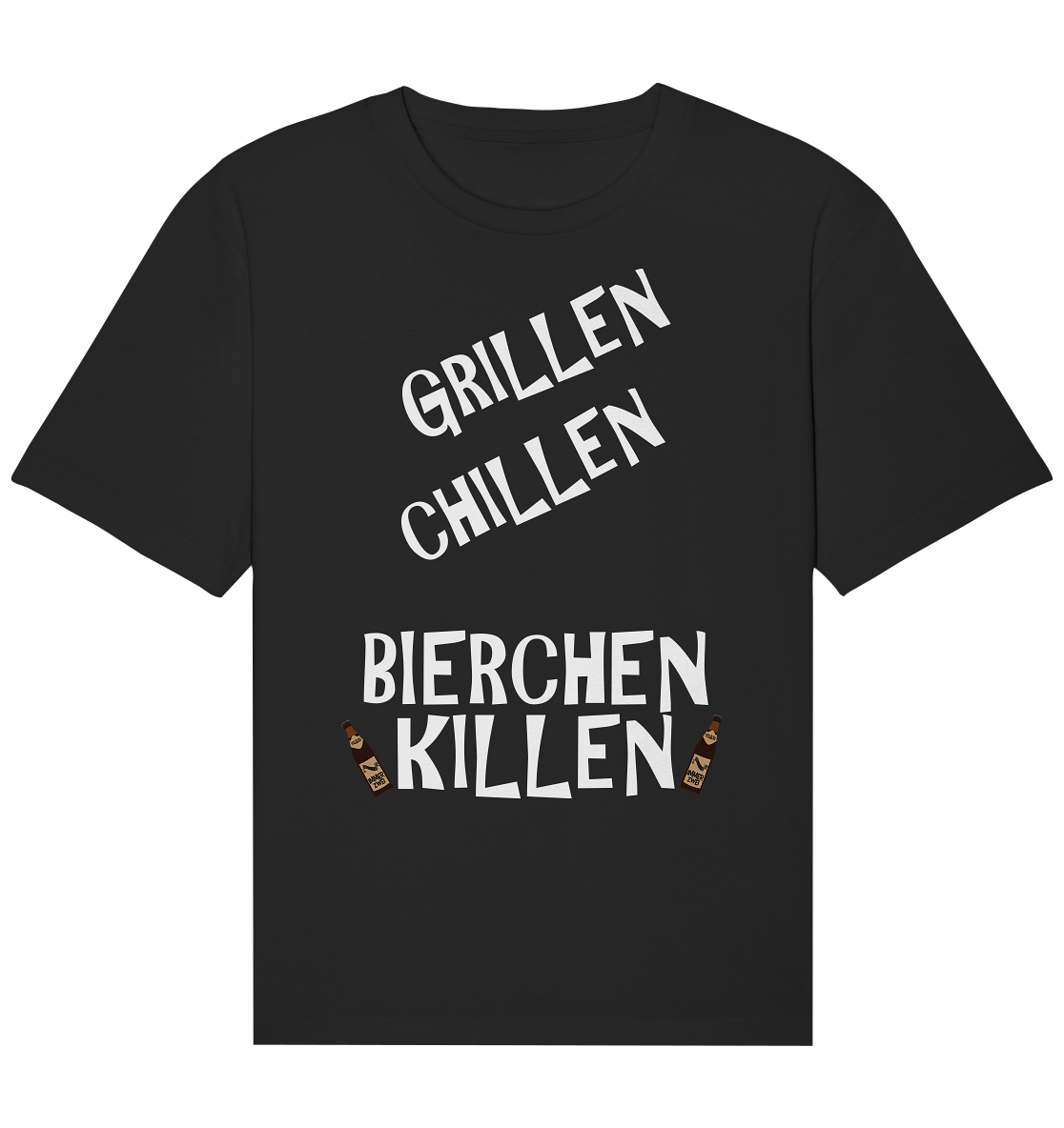 Bereit für den Sommer-Look? Hol dir jetzt unser neues T-Shirt, Kapuzenpullover oder Sweater mit dem coolen Aufdruck "Grillen Chillen Bierchen Killen" und 2 Bierflaschen-Bildchen. Zeige allen, dass du bereit bist für gutes Essen, kühles Bier und chillige Stimmung. Bestelle jetzt!